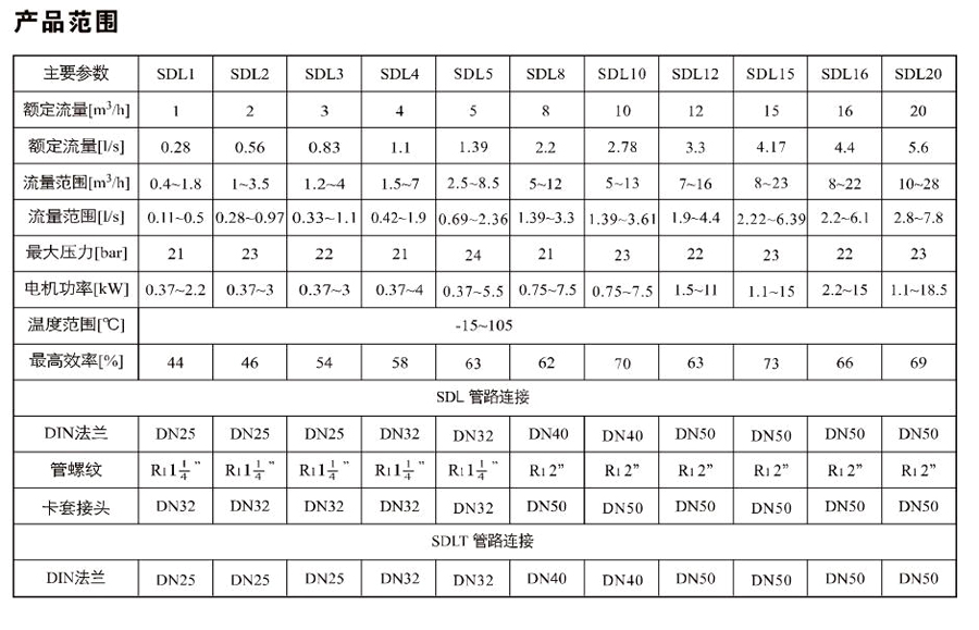 SDL4/SDLT4是一種多功能產(chǎn)品,可以輸送從自來水到工業(yè)液體的各種不同介質(zhì),適用于不同溫度、流量和壓力范圍。